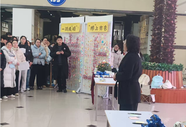 12月19日上午,我校图书馆大厅内暖意融融,一场名为“棒”上有名、一战成“硕”的暖心助研活动在此温情启幕。图书馆为即将奔赴考场的考研学子精心准备了1500余份“甜蜜加油包”,用创意与心意传递真挚祝福。现场,五彩棒棒糖拼出醒目的“上岸”二字,金黄薯片盒垒成寓意“高中”的“中”字造型,每一根棒棒糖上更系有手写祝福标签——“前路光明”“一‘研’为定”“笔锋所至,梦想花开”……字句暖心,寄托着浓浓关怀。