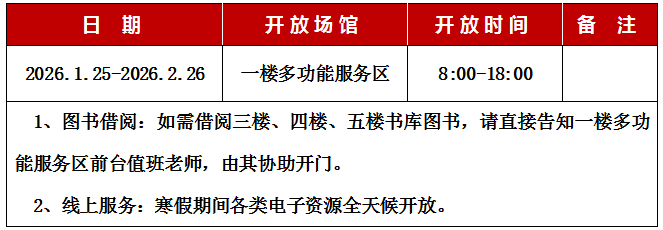 根据学校《关于做好2026年寒假前后有关工作的通知》精神,为满足广大师生读者对图书馆服务的需求,图书馆寒假期间开放时间与服务安排如下: