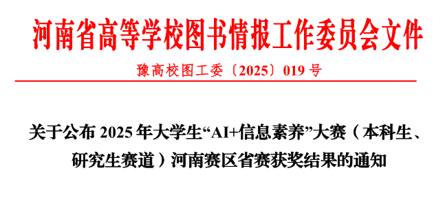 近日,由河南省教育厅高等教育处指导,河南省高等学校图书情报工作委员会主办的2025 年大学生“AI+信息素养”大赛河南赛区比赛圆满落幕。图书资源中心积极组织学生参赛,最终共有12名学生组成4支队伍脱颖而出,荣获多项省级奖项,学校同时获评“优秀组织奖”。