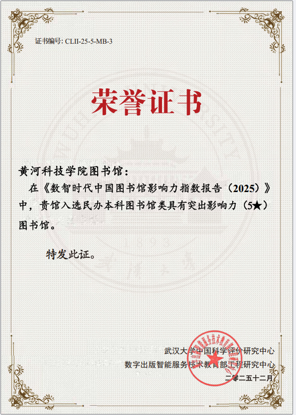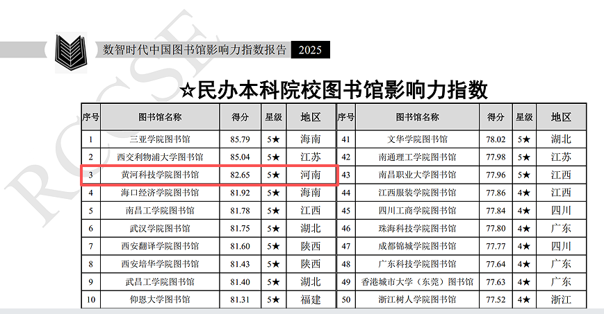 近日,在武汉大学中国科学评价研究中心(RCCSE)最新发布的《数智时代中国图书馆影响力指数报告(2025)》显示,黄河科技学院图书馆以卓越表现,获评最高等级的“民办本科院校图书馆-突出影响力(5★)图书馆”,在全国民办本科高校中综合得分第三,在河南省民办高校中位列第一。