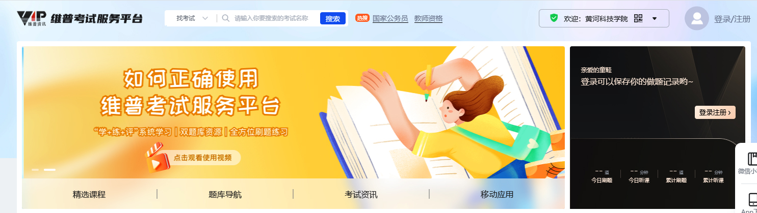 《维普考试服务平台》是集视频课程、职业题库、专业题库资源于一体,为用户提供在线听课、刷题训练、考试资讯等系列服务的一体化学习应用系统。平台拥有科学系统的精选专辑、全面丰富的考试题库、辅助备考的考试资讯,致力于实现全方位、一体化的学习服务形态,以满足用户高品质、高效率的学习服务需求。