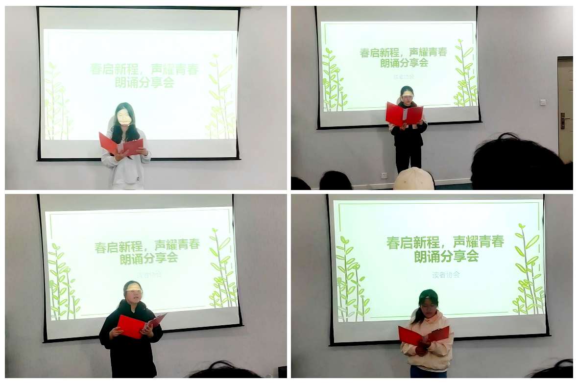 在朗诵展示环节,4位朗诵者依次登台,用声情并茂的演绎,诉说着成长的感悟、初心的坚守与理想的追求:王亚波同学以“不纠结过往,不内耗自己”的清醒宣言,传递着向前看、向未来的坚定力量;韩若田同学以春日意象为喻,结合冰心、汪国真的经典诗句,呼吁青春应向阳生长、真诚发声;崔殿静同学怀念年少纯粹勇敢的自己,在文字中感慨成长与世故,渴望重归赤诚本心;高晨露同学则以“山风不止,初心不改;山花落尽,我心犹青”的深情朗诵,让在场听众感受到抵御岁月寒凉、坚守内心青翠的力量。每一段朗诵都赢得了阵阵掌声,现场氛围热烈而温暖。